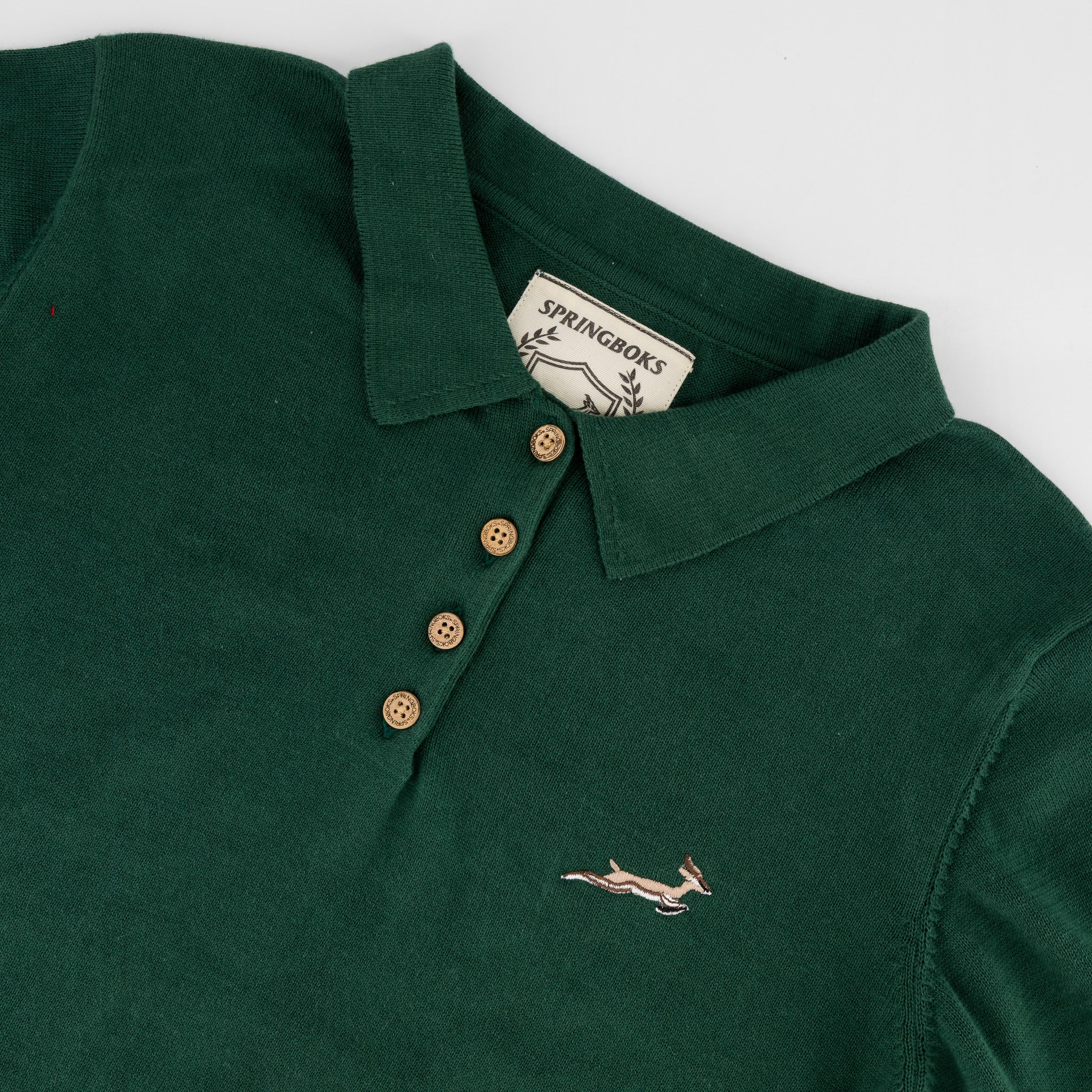 A refined knitted polo for women in signature OS green, crafted for heritage appeal and everyday wear. Tailored with a soft yet structured knit, it features a classic collar and a five-button placket for polished styling. Embroidered with the Springbok motif at the chest for subtle branding.